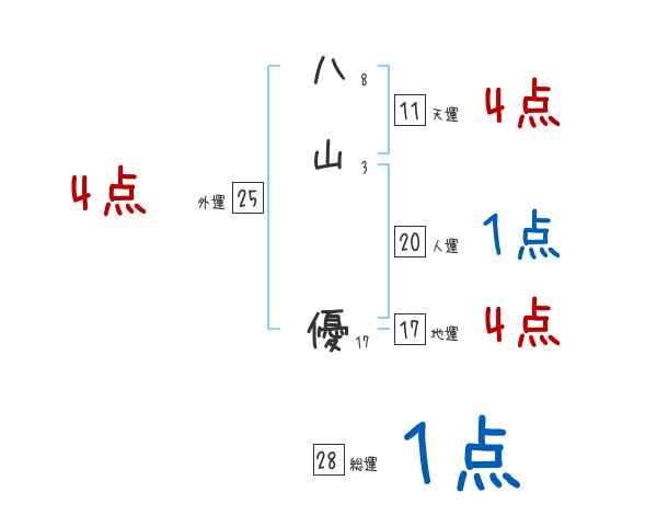 天運![]() | 八山優さんの天運は11画の4つ星!着実に富や地位を得る幸運な人生。 家系が持つ宿命的な運勢を表します。祖先から受け継いだ苗字ですので自分の力が及びません。家柄を象徴します。 |