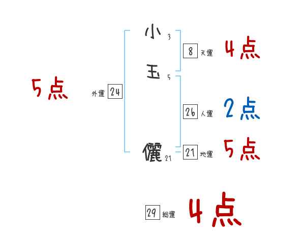 外運![]() | 小玉儷さんの外運は24画の5つ星!家庭運が良く順調な人生。金運にも恵まれる。 生活面を象徴する運勢です。外部から受ける影響力を表し、結婚運、家庭運や職場、環境への順応性を表します。 |