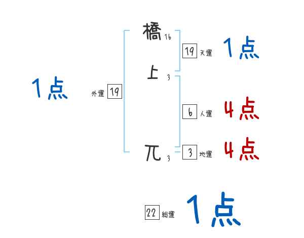 外運![]() | 橋上兀さんの外運は19画の1つ星!優れた才能を持ちますが、協調性が足りないことも。周りの人と協力する事を意識しましょう。 生活面を象徴する運勢です。外部から受ける影響力を表し、結婚運、家庭運や職場、環境への順応性を表します。 |