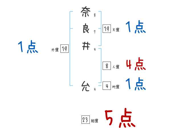 天運![]() | 奈良井允さんの天運は19画の1つ星!優れた才能を持ちますが、協調性が足りないことも。周りの人と協力する事を意識しましょう。 家系が持つ宿命的な運勢を表します。祖先から受け継いだ苗字ですので自分の力が及びません。家柄を象徴します。 |