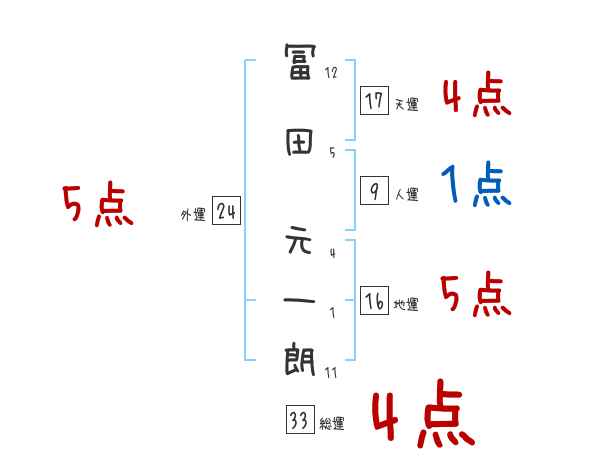 外運![]() | 冨田元一朗さんの外運は24画の5つ星!家庭運が良く順調な人生。金運にも恵まれる。 生活面を象徴する運勢です。外部から受ける影響力を表し、結婚運、家庭運や職場、環境への順応性を表します。 |