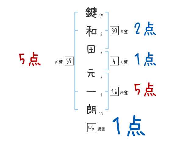 外運![]() | 鍵和田元一朗さんの外運は37画の5つ星!努力家で順応性に優れる。現実的な考え方ができ忠実に物事をこなす。 生活面を象徴する運勢です。外部から受ける影響力を表し、結婚運、家庭運や職場、環境への順応性を表します。 |