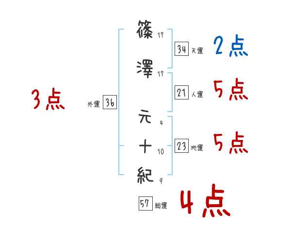 天運![]() | 篠澤元十紀さんの天運は34画の2つ星!独創性に優れるが、自尊心が強く災難に注意しましょう。 家系が持つ宿命的な運勢を表します。祖先から受け継いだ苗字ですので自分の力が及びません。家柄を象徴します。 |