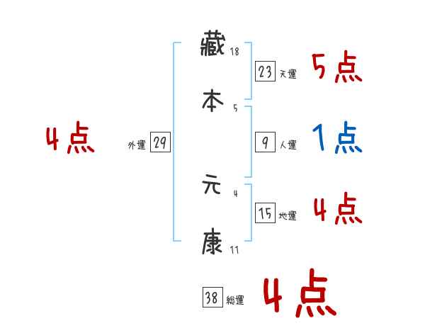 天運![]() | 藏本元康さんの天運は23画の5つ星!想像力に優れ活力がある。一代で成功し名誉を手に入れる。 家系が持つ宿命的な運勢を表します。祖先から受け継いだ苗字ですので自分の力が及びません。家柄を象徴します。 |