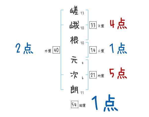 総運![]() | 嵯峨根元次朗さんの総運は54画の1つ星!トラブルが多いかも。周りをよく見て協調して過ごしましょう。 あなたの人生を表す1番重要な運勢です。生涯を通じて影響する総合運となり、主に50歳以降の晩年期に影響を及ぼします。 |