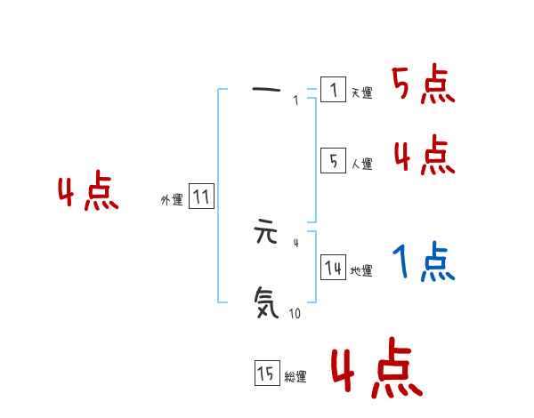 天運![]() | 一元気さんの天運は1画の5つ星!行動力、指導力があり出世し繁栄する。幸運に恵まれる。 家系が持つ宿命的な運勢を表します。祖先から受け継いだ苗字ですので自分の力が及びません。家柄を象徴します。 |