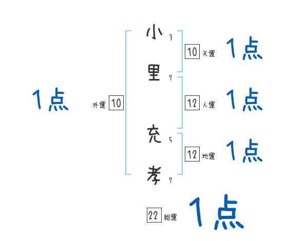 天運![]() | 小里充孝さんの天運は10画の1つ星!不安を感じやすい傾向。ストレスを抱えないように注意しましょう。 家系が持つ宿命的な運勢を表します。祖先から受け継いだ苗字ですので自分の力が及びません。家柄を象徴します。 |