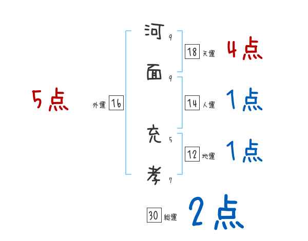 外運![]() | 河面充孝さんの外運は16画の5つ星!人望が厚く大きく発展する。逆転成功が見える。 生活面を象徴する運勢です。外部から受ける影響力を表し、結婚運、家庭運や職場、環境への順応性を表します。 |