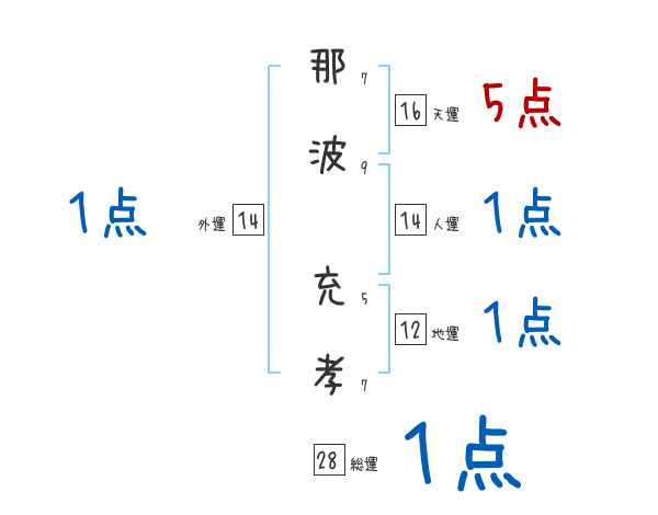 天運![]() | 那波充孝さんの天運は16画の5つ星!人望が厚く大きく発展する。逆転成功が見える。 家系が持つ宿命的な運勢を表します。祖先から受け継いだ苗字ですので自分の力が及びません。家柄を象徴します。 |