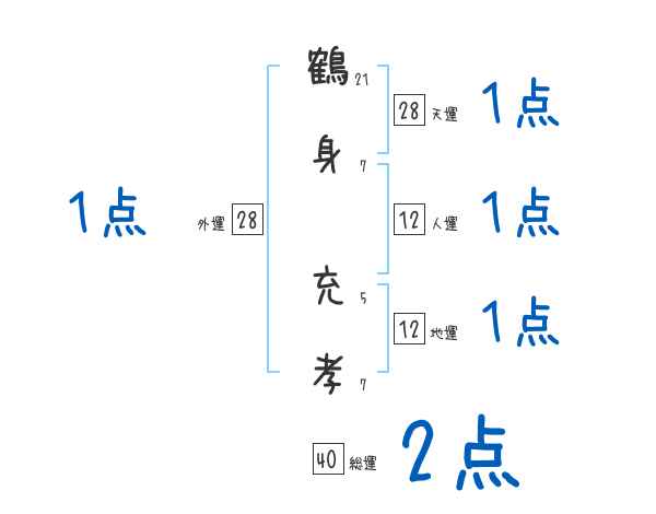 天運![]() | 鶴身充孝さんの天運は28画の1つ星!家庭環境に注意。スポーツで活躍できる能力があるかも。 家系が持つ宿命的な運勢を表します。祖先から受け継いだ苗字ですので自分の力が及びません。家柄を象徴します。 |