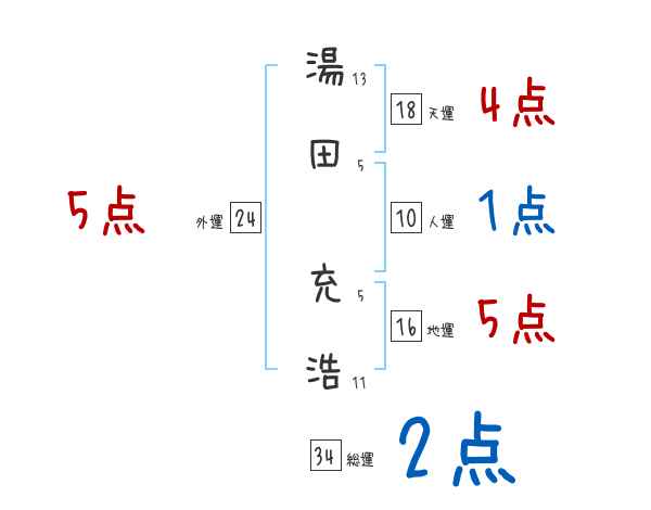 総運![]() | 湯田充浩さんの総運は34画の2つ星!独創性に優れるが、自尊心が強く災難に注意しましょう。 あなたの人生を表す1番重要な運勢です。生涯を通じて影響する総合運となり、主に50歳以降の晩年期に影響を及ぼします。 |