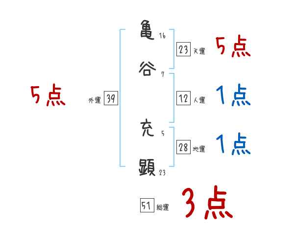 天運![]() | 亀谷充顕さんの天運は23画の5つ星!想像力に優れ活力がある。一代で成功し名誉を手に入れる。 家系が持つ宿命的な運勢を表します。祖先から受け継いだ苗字ですので自分の力が及びません。家柄を象徴します。 |