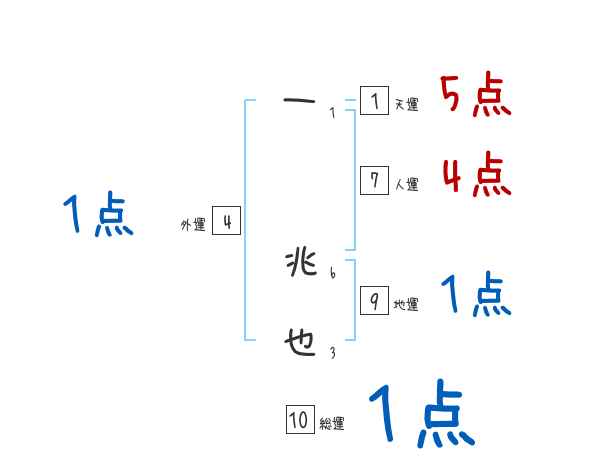 天運![]() | 一兆也さんの天運は1画の5つ星!行動力、指導力があり出世し繁栄する。幸運に恵まれる。 家系が持つ宿命的な運勢を表します。祖先から受け継いだ苗字ですので自分の力が及びません。家柄を象徴します。 |