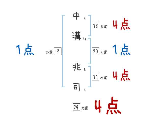 天運![]() | 中溝兆司さんの天運は18画の4つ星!情熱的で剛気。忍耐力があり信頼される。 家系が持つ宿命的な運勢を表します。祖先から受け継いだ苗字ですので自分の力が及びません。家柄を象徴します。 |
