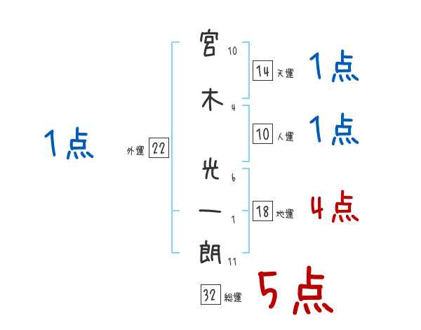 外運![]() | 宮木光一朗さんの外運は22画の1つ星!努力することが苦手ないっぽう手先が器用。芸術性にも優れる。 生活面を象徴する運勢です。外部から受ける影響力を表し、結婚運、家庭運や職場、環境への順応性を表します。 |