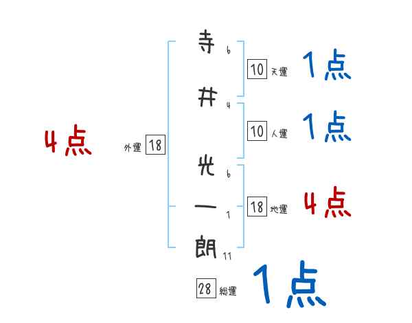 外運![]() | 寺井光一朗さんの外運は18画の4つ星!情熱的で剛気。忍耐力があり信頼される。 生活面を象徴する運勢です。外部から受ける影響力を表し、結婚運、家庭運や職場、環境への順応性を表します。 |