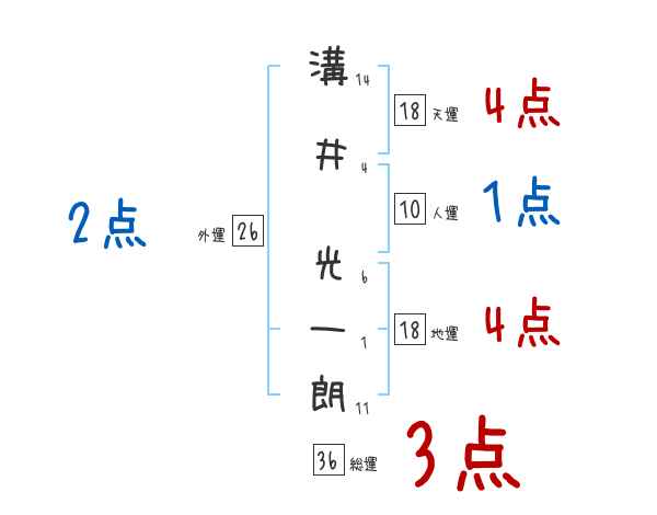 総運![]() | 溝井光一朗さんの総運は36画の3つ星!先見性が豊かです。多少神経質で苦労することも。 あなたの人生を表す1番重要な運勢です。生涯を通じて影響する総合運となり、主に50歳以降の晩年期に影響を及ぼします。 |