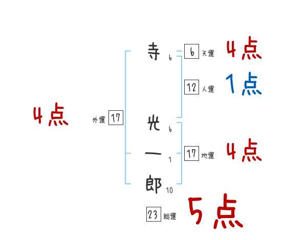 外運![]() | 寺光一郎さんの外運は17画の4つ星!積極的な行動力。地位を気づき財産を手に入れる。純粋な心と直感力。 生活面を象徴する運勢です。外部から受ける影響力を表し、結婚運、家庭運や職場、環境への順応性を表します。 |