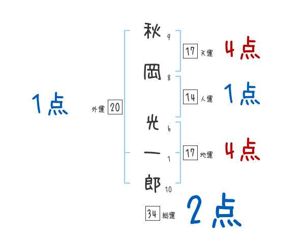 天運![]() | 秋岡光一郎さんの天運は17画の4つ星!積極的な行動力。地位を気づき財産を手に入れる。純粋な心と直感力。 家系が持つ宿命的な運勢を表します。祖先から受け継いだ苗字ですので自分の力が及びません。家柄を象徴します。 |