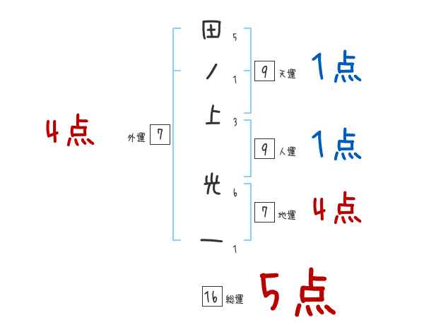 総運![]() | 田ノ上光一さんの総運は16画の5つ星!人望が厚く大きく発展する。逆転成功が見える。 あなたの人生を表す1番重要な運勢です。生涯を通じて影響する総合運となり、主に50歳以降の晩年期に影響を及ぼします。 |