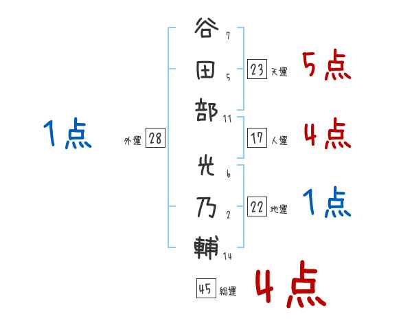 総運![]() | 谷田部光乃輔さんの総運は45画の4つ星!もくもくと物事を進め達成する。地味な努力家。 あなたの人生を表す1番重要な運勢です。生涯を通じて影響する総合運となり、主に50歳以降の晩年期に影響を及ぼします。 |