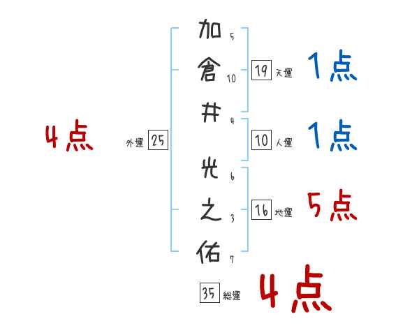 総運![]() | 加倉井光之佑さんの総運は35画の4つ星!温厚な性格で感受性が高い。穏和な性格で人望が厚い。 あなたの人生を表す1番重要な運勢です。生涯を通じて影響する総合運となり、主に50歳以降の晩年期に影響を及ぼします。 |