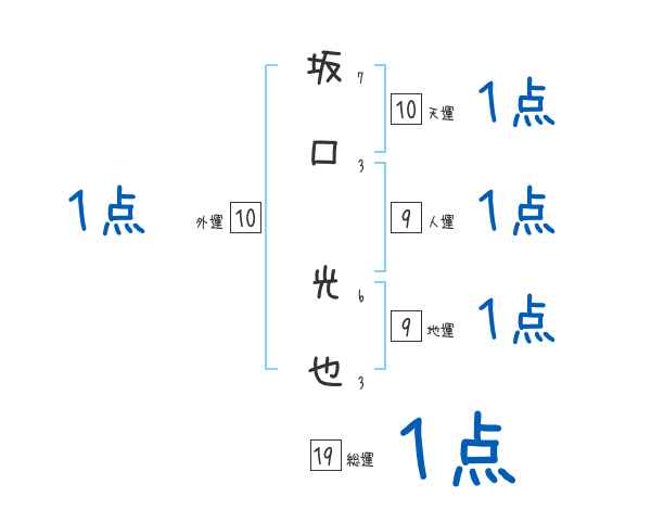 天運![]() | 坂口光也さんの天運は10画の1つ星!不安を感じやすい傾向。ストレスを抱えないように注意しましょう。 家系が持つ宿命的な運勢を表します。祖先から受け継いだ苗字ですので自分の力が及びません。家柄を象徴します。 |