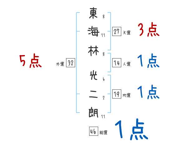 外運![]() | 東海林光二朗さんの外運は32画の5つ星!柔軟性があり成功する。チャンスが多く金運が良い。 生活面を象徴する運勢です。外部から受ける影響力を表し、結婚運、家庭運や職場、環境への順応性を表します。 |