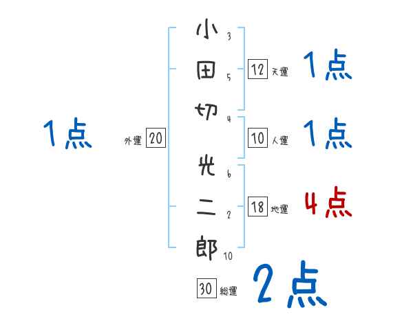 天運![]() | 小田切光二郎さんの天運は12画の1つ星!簡単な失敗で諦めてしまいやすいかも。着実に行動すると良いでしょう。 家系が持つ宿命的な運勢を表します。祖先から受け継いだ苗字ですので自分の力が及びません。家柄を象徴します。 |