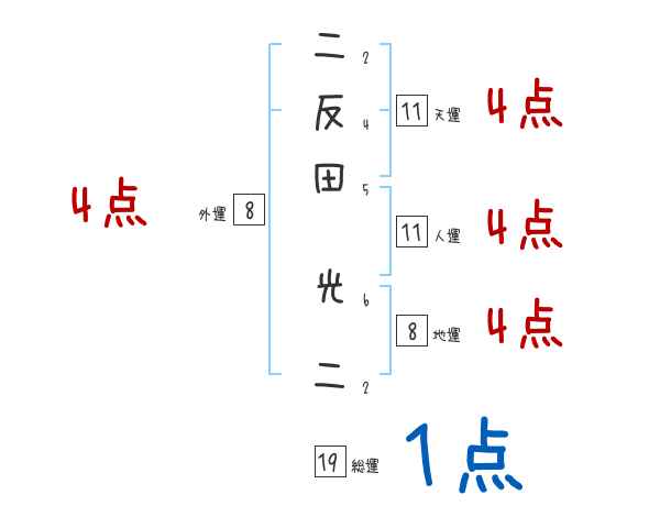 天運![]() | 二反田光二さんの天運は11画の4つ星!着実に富や地位を得る幸運な人生。 家系が持つ宿命的な運勢を表します。祖先から受け継いだ苗字ですので自分の力が及びません。家柄を象徴します。 |