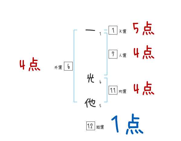 天運![]() | 一光他さんの天運は1画の5つ星!行動力、指導力があり出世し繁栄する。幸運に恵まれる。 家系が持つ宿命的な運勢を表します。祖先から受け継いだ苗字ですので自分の力が及びません。家柄を象徴します。 |