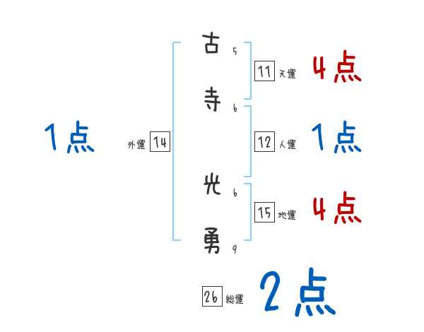 天運![]() | 古寺光勇さんの天運は11画の4つ星!着実に富や地位を得る幸運な人生。 家系が持つ宿命的な運勢を表します。祖先から受け継いだ苗字ですので自分の力が及びません。家柄を象徴します。 |