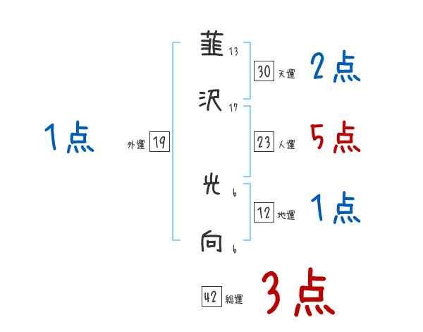 天運![]() | 韮沢光向さんの天運は30画の2つ星!浮き沈みの激しさに注意しましょう。 家系が持つ宿命的な運勢を表します。祖先から受け継いだ苗字ですので自分の力が及びません。家柄を象徴します。 |