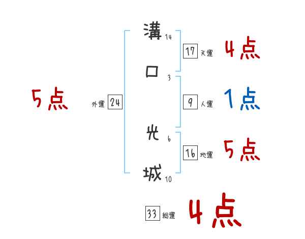 外運![]() | 溝口光城さんの外運は24画の5つ星!家庭運が良く順調な人生。金運にも恵まれる。 生活面を象徴する運勢です。外部から受ける影響力を表し、結婚運、家庭運や職場、環境への順応性を表します。 |