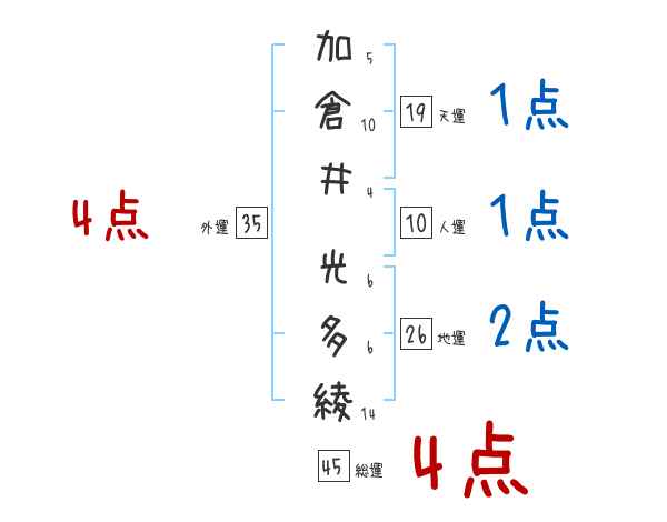 外運![]() | 加倉井光多綾さんの外運は35画の4つ星!温厚な性格で感受性が高い。穏和な性格で人望が厚い。 生活面を象徴する運勢です。外部から受ける影響力を表し、結婚運、家庭運や職場、環境への順応性を表します。 |