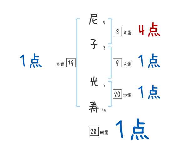 総運![]() | 尼子光寿さんの総運は28画の1つ星!家庭環境に注意。スポーツで活躍できる能力があるかも。 あなたの人生を表す1番重要な運勢です。生涯を通じて影響する総合運となり、主に50歳以降の晩年期に影響を及ぼします。 |