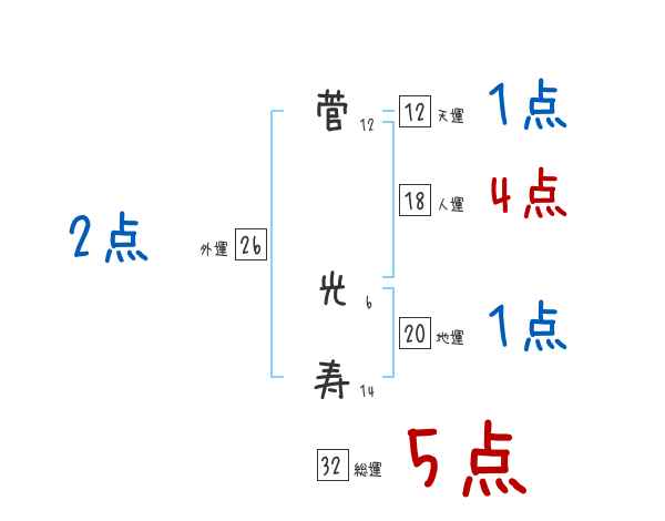 総運![]() | 菅光寿さんの総運は32画の5つ星!柔軟性があり成功する。チャンスが多く金運が良い。 あなたの人生を表す1番重要な運勢です。生涯を通じて影響する総合運となり、主に50歳以降の晩年期に影響を及ぼします。 |