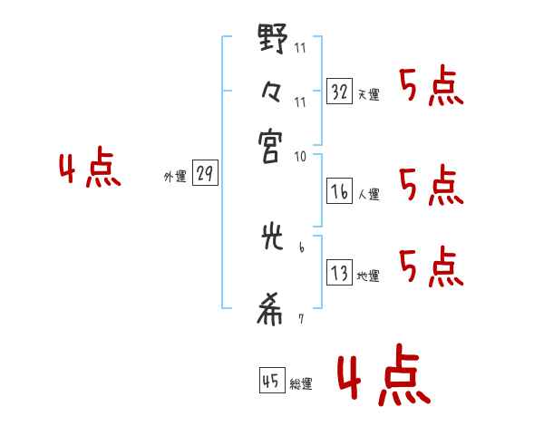 天運![]() | 野々宮光希さんの天運は32画の5つ星!柔軟性があり成功する。チャンスが多く金運が良い。 家系が持つ宿命的な運勢を表します。祖先から受け継いだ苗字ですので自分の力が及びません。家柄を象徴します。 |