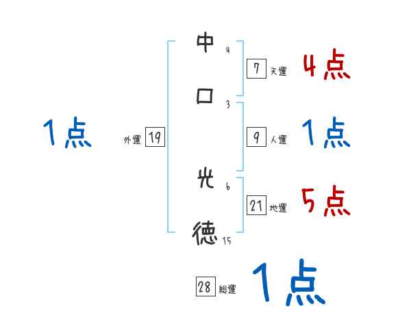 天運![]() | 中口光徳さんの天運は7画の4つ星!強い意志や信念を持ち独立心が強い。自立する。 家系が持つ宿命的な運勢を表します。祖先から受け継いだ苗字ですので自分の力が及びません。家柄を象徴します。 |