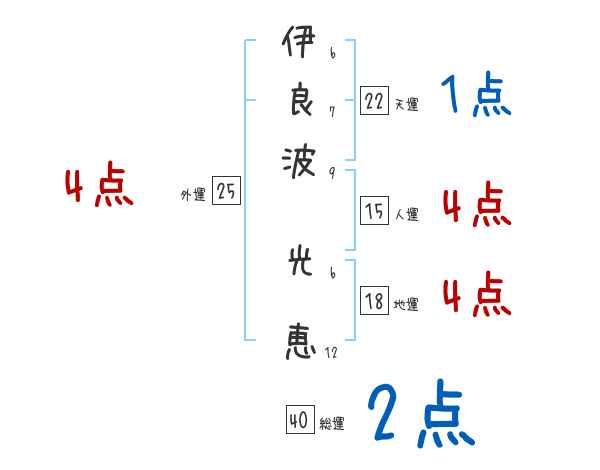 天運![]() | 伊良波光恵さんの天運は22画の1つ星!努力することが苦手ないっぽう手先が器用。芸術性にも優れる。 家系が持つ宿命的な運勢を表します。祖先から受け継いだ苗字ですので自分の力が及びません。家柄を象徴します。 |