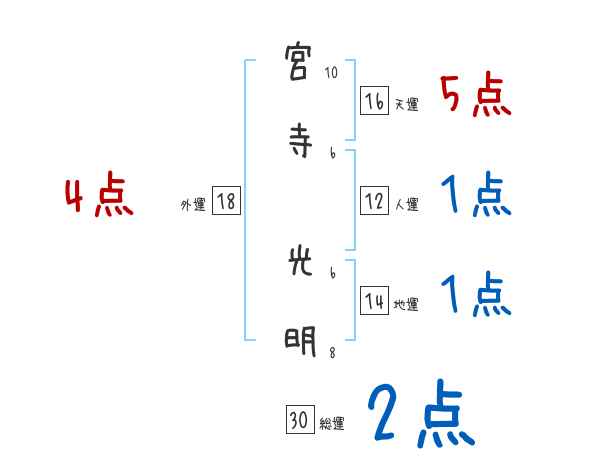 天運![]() | 宮寺光明さんの天運は16画の5つ星!人望が厚く大きく発展する。逆転成功が見える。 家系が持つ宿命的な運勢を表します。祖先から受け継いだ苗字ですので自分の力が及びません。家柄を象徴します。 |