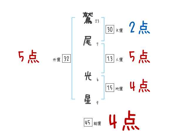 天運![]() | 鷲尾光星さんの天運は30画の2つ星!浮き沈みの激しさに注意しましょう。 家系が持つ宿命的な運勢を表します。祖先から受け継いだ苗字ですので自分の力が及びません。家柄を象徴します。 |