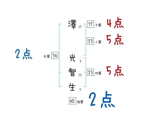 外運![]() | 澤光智生さんの外運は34画の2つ星!独創性に優れるが、自尊心が強く災難に注意しましょう。 生活面を象徴する運勢です。外部から受ける影響力を表し、結婚運、家庭運や職場、環境への順応性を表します。 |
