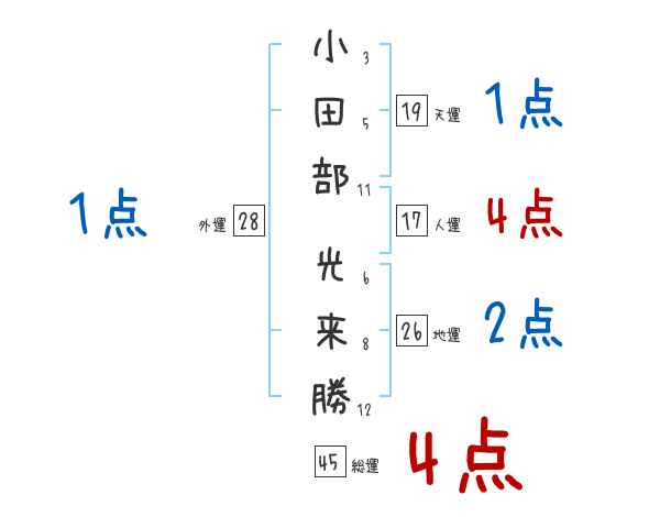 天運![]() | 小田部光来勝さんの天運は19画の1つ星!優れた才能を持ちますが、協調性が足りないことも。周りの人と協力する事を意識しましょう。 家系が持つ宿命的な運勢を表します。祖先から受け継いだ苗字ですので自分の力が及びません。家柄を象徴します。 |