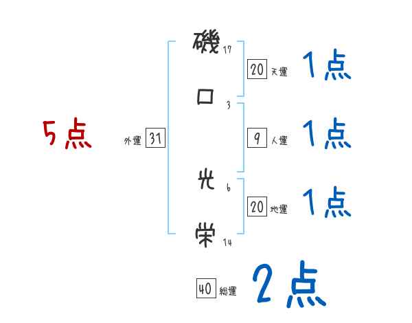 外運![]() | 磯口光栄さんの外運は31画の5つ星!社交性があり判断力に優れる。順風満帆な人生で円満な生活。 生活面を象徴する運勢です。外部から受ける影響力を表し、結婚運、家庭運や職場、環境への順応性を表します。 |