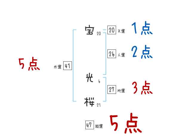 外運![]() | 宝光桜さんの外運は41画の5つ星!大志を抱き、目標に向かって実力を発揮し達成する。温和な性格。 生活面を象徴する運勢です。外部から受ける影響力を表し、結婚運、家庭運や職場、環境への順応性を表します。 |