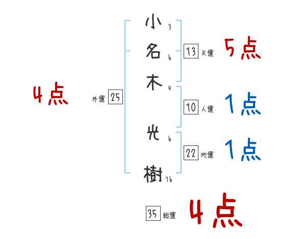 総運![]() | 小名木光樹さんの総運は35画の4つ星!温厚な性格で感受性が高い。穏和な性格で人望が厚い。 あなたの人生を表す1番重要な運勢です。生涯を通じて影響する総合運となり、主に50歳以降の晩年期に影響を及ぼします。 |