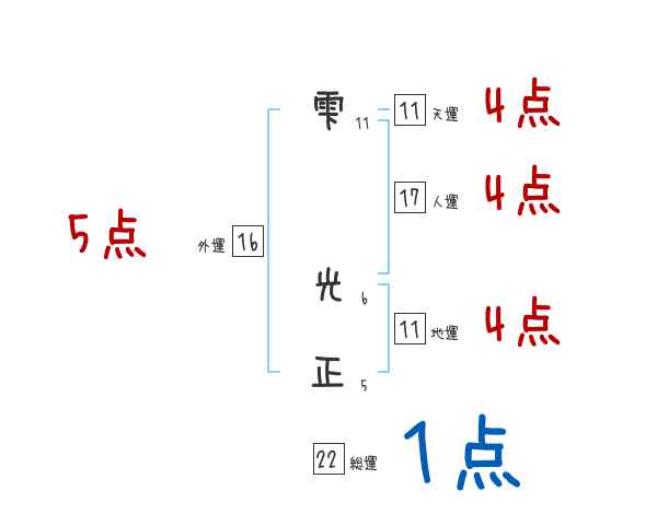 外運![]() | 雫光正さんの外運は16画の5つ星!人望が厚く大きく発展する。逆転成功が見える。 生活面を象徴する運勢です。外部から受ける影響力を表し、結婚運、家庭運や職場、環境への順応性を表します。 |