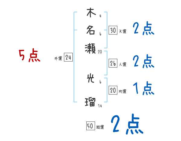 外運![]() | 木名瀬光瑠さんの外運は24画の5つ星!家庭運が良く順調な人生。金運にも恵まれる。 生活面を象徴する運勢です。外部から受ける影響力を表し、結婚運、家庭運や職場、環境への順応性を表します。 |