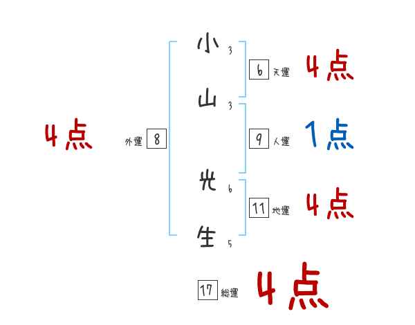 総運![]() | 小山光生さんの総運は17画の4つ星!積極的な行動力。地位を気づき財産を手に入れる。純粋な心と直感力。 あなたの人生を表す1番重要な運勢です。生涯を通じて影響する総合運となり、主に50歳以降の晩年期に影響を及ぼします。 |